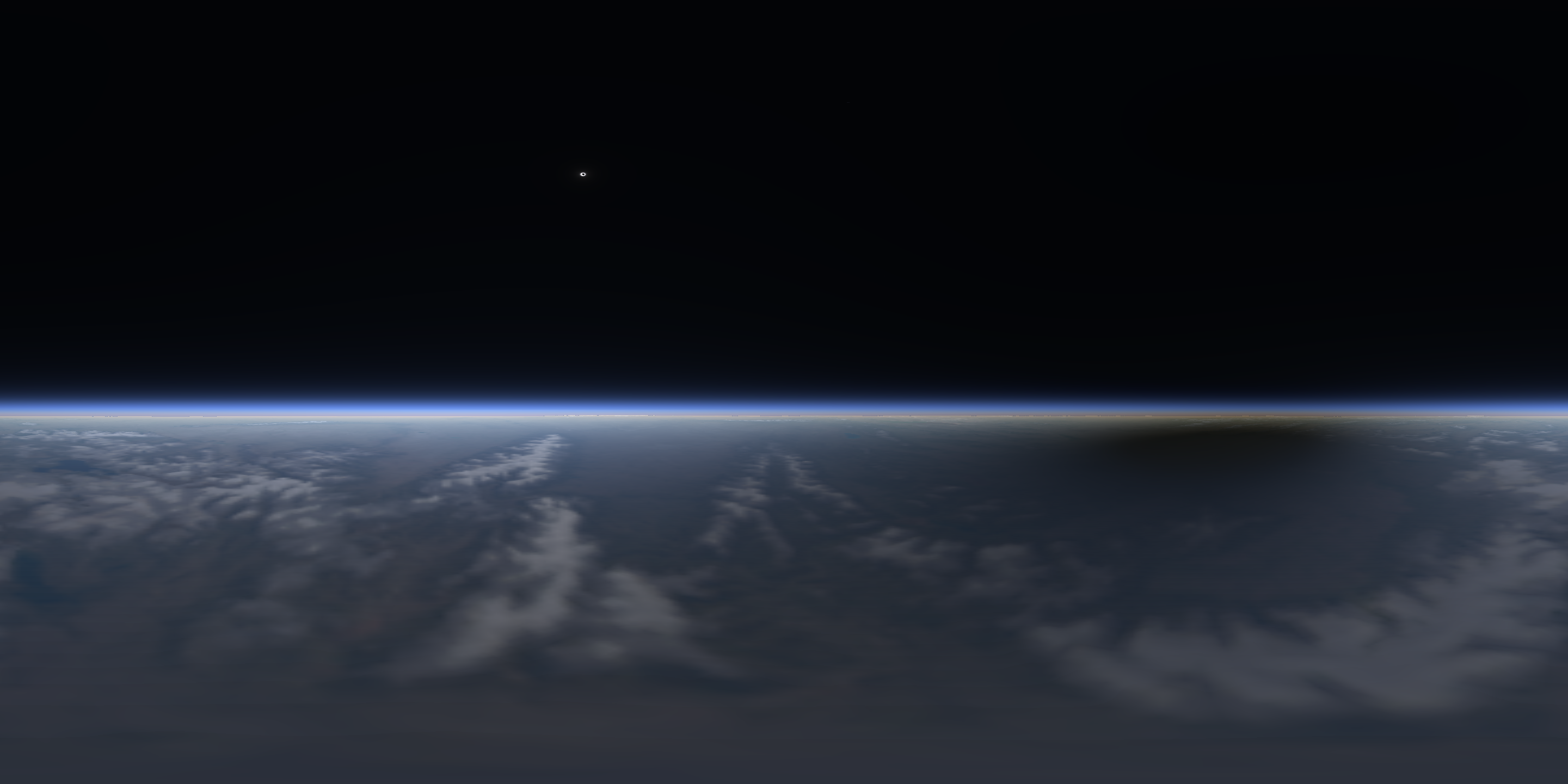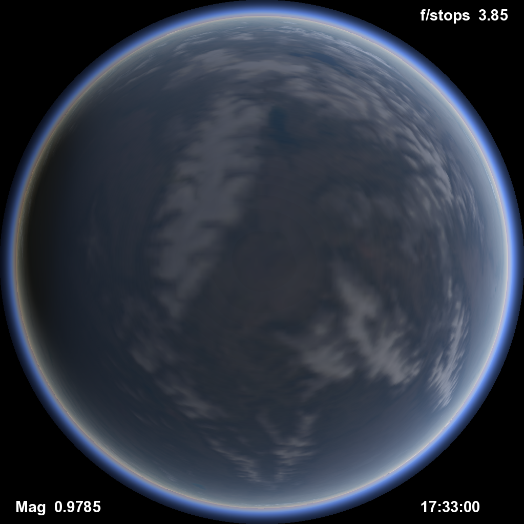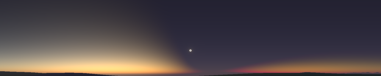 in clear skies looking up at the sky hemisphere from the ground. We see the moon's shadow sweeping across the sky. To render this, the shape of the moon's shadow slicing through the atmosphere is considered. Single scattering is calculated first as light from the parts of the sky in the penumbra are scattered and observed, including when the viewpoint is within the umbra. Limb darkening is accounted for when determining the solar irradiance at various locations in the penumbra. Secondary scattering is estimated to help calculate the sky brightness within the umbra. The location is Jackson Wyoming for the 2017 eclipse. Brightnesses are adjusted uniformly over the images by differing amounts when the eclipse magnitude is somewhat less than unity (when one is significantly outside the umbra). Note the sky (in this clear sky case) would be darker than most eclipses due to the thin clean air at this altitude.North is up and east is to the left in this fish-eye or dome view. The horizon rings around the edge. We can see Venus coming out near and during totality. The corona is visible even before totality as part of it exceeds the sky brightness, and glare from the bright crescent sun in the camera (or human eye) isn't being included.