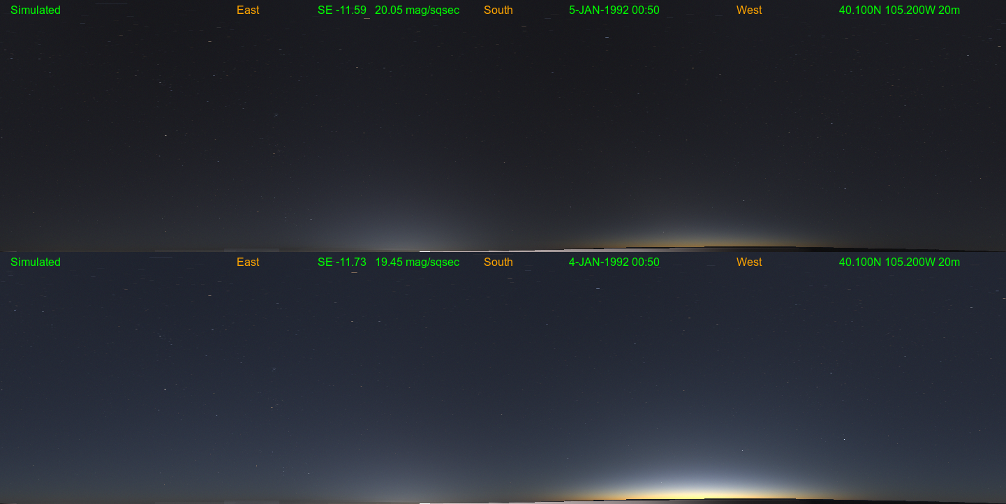 The image frame above (click for animation) shows about an hour after sunset where the top frame has the eclipse and the bottom from the day before is a control without an eclipse. The twilight arch is dimmed by the eclipse though the stars and city lights remain the same. I recall a similar visual view of the twilight that evening. Even though it was clear the twilight seemed like a cloudy day, and never recovered after maximum eclipse.