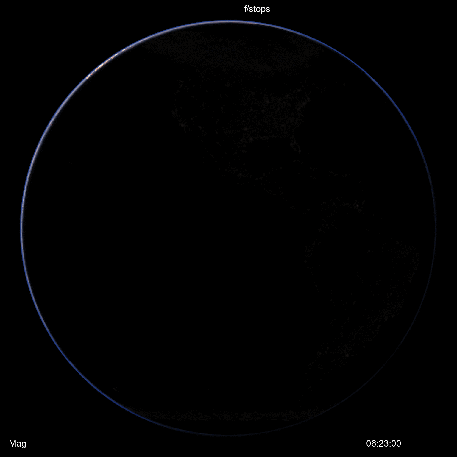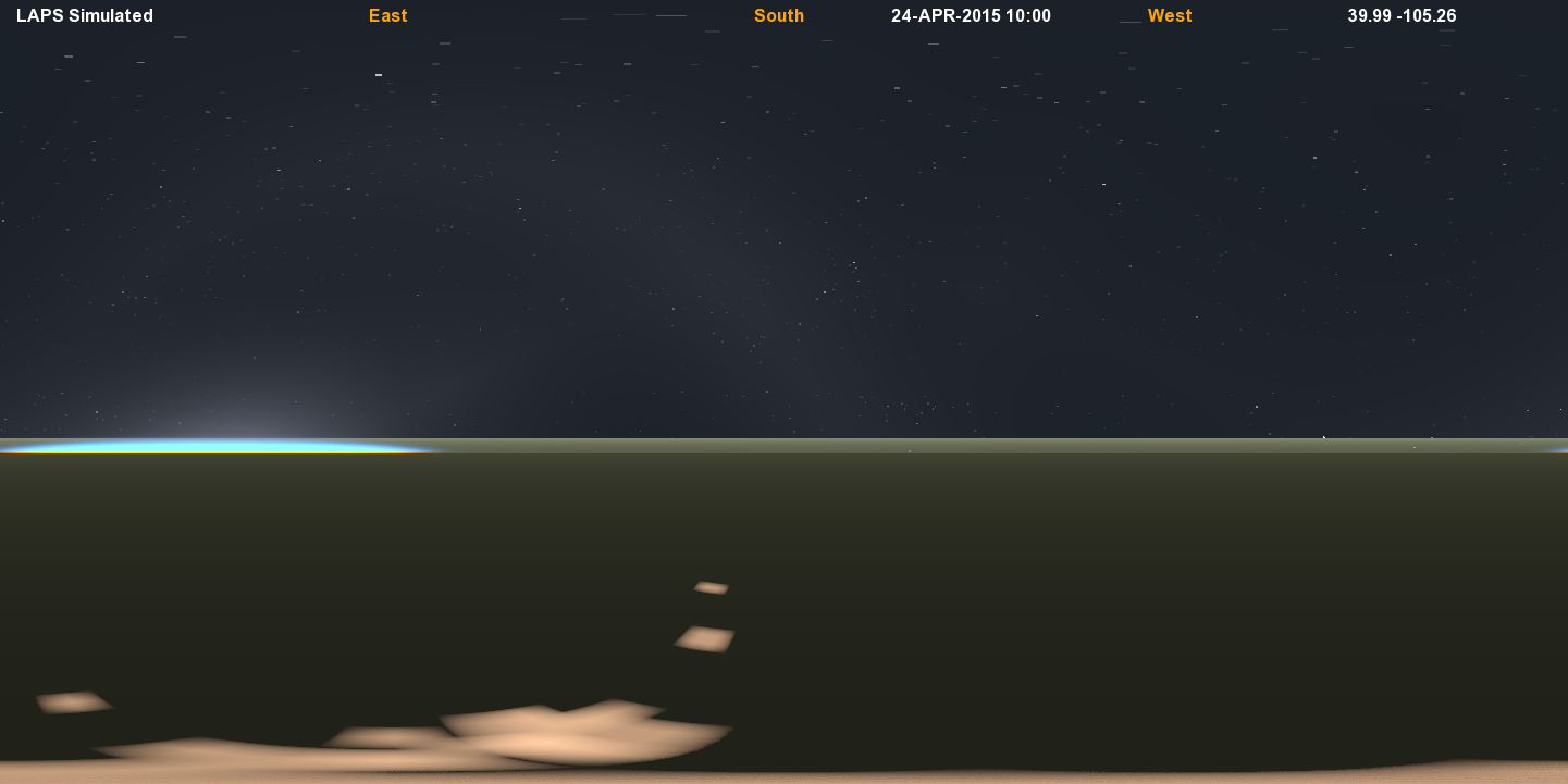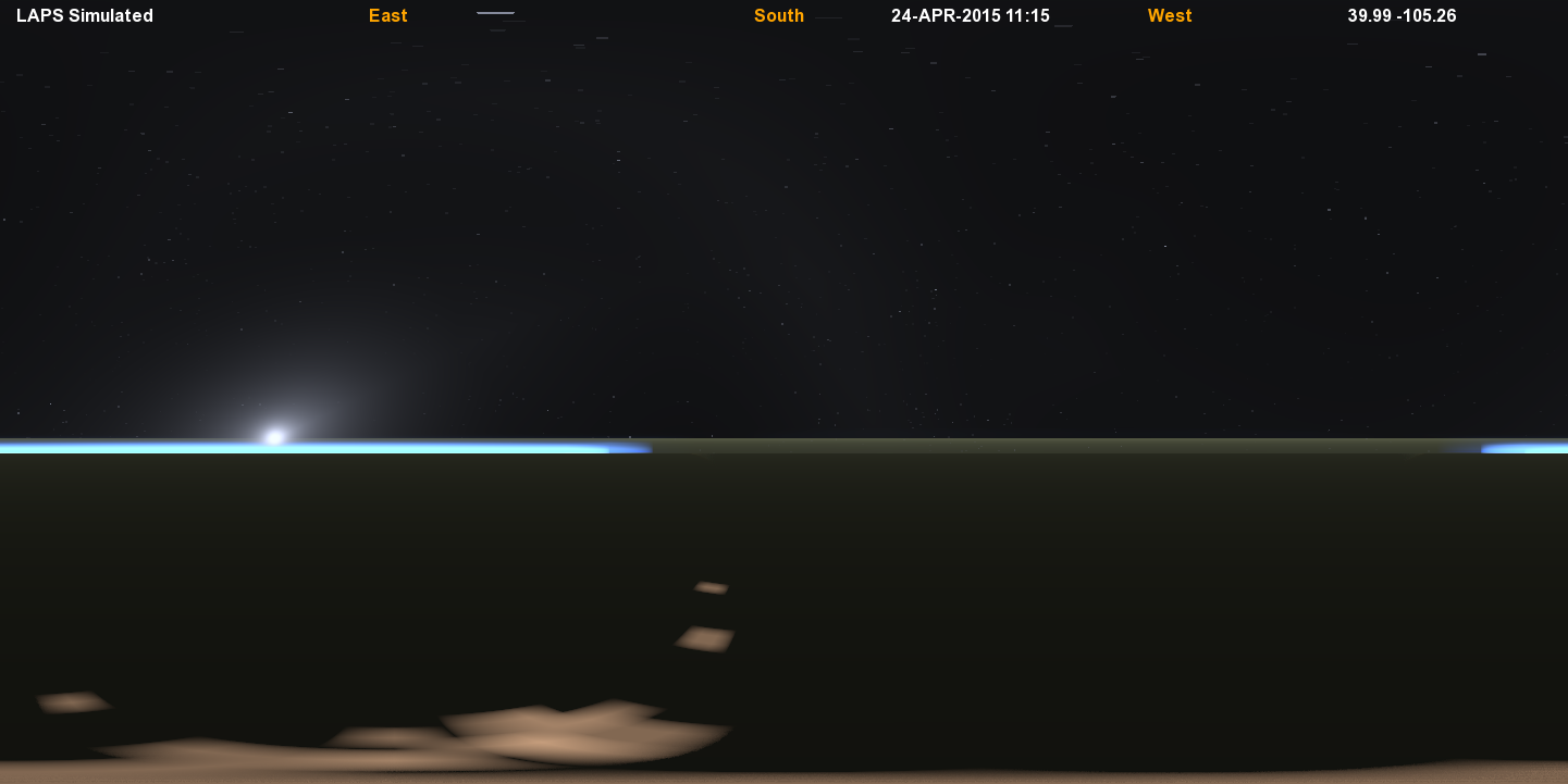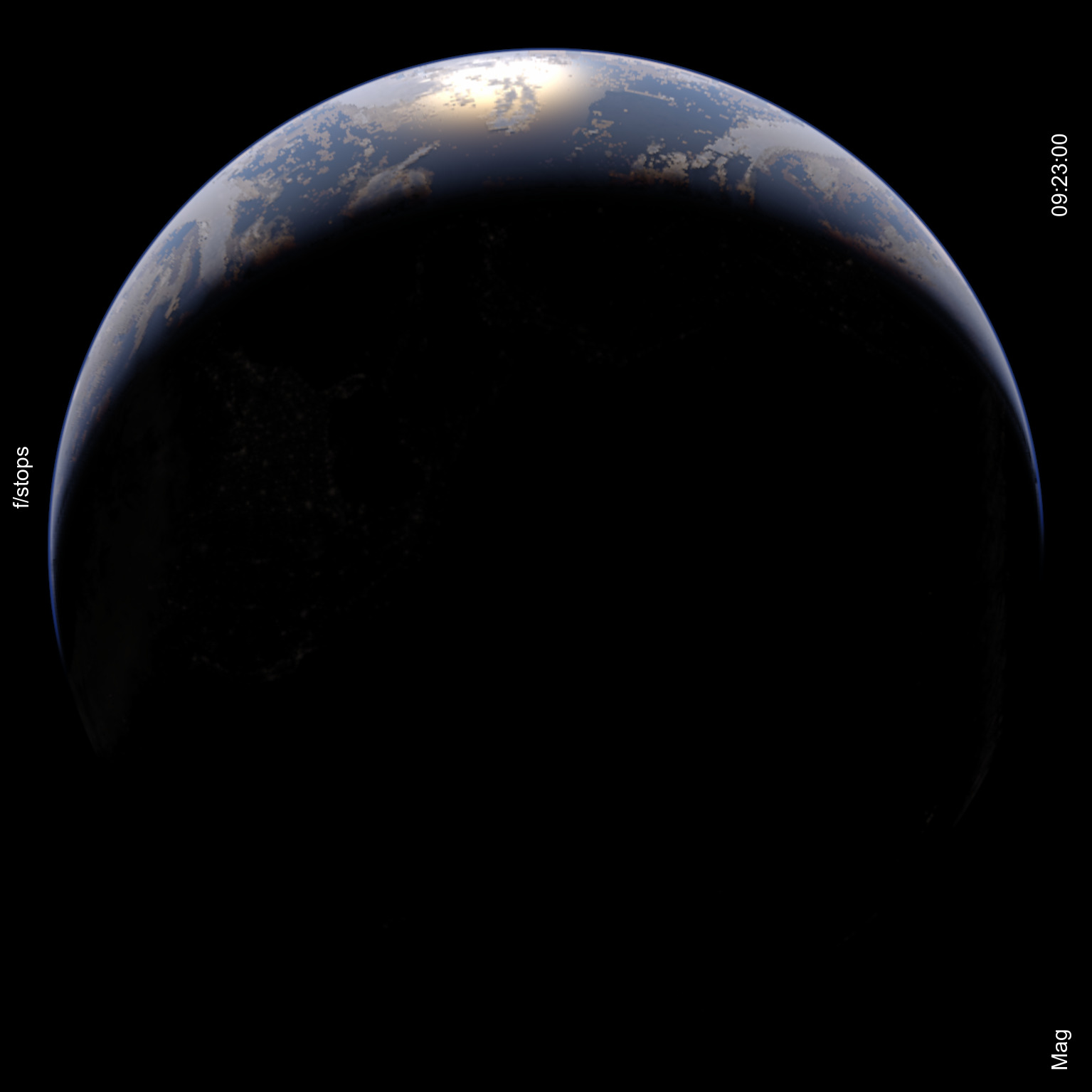 This view has twilight just beginning with the sun located 15.95 degrees below the limb. The limb itself is pushed down quite a bit below the horizontal due to the