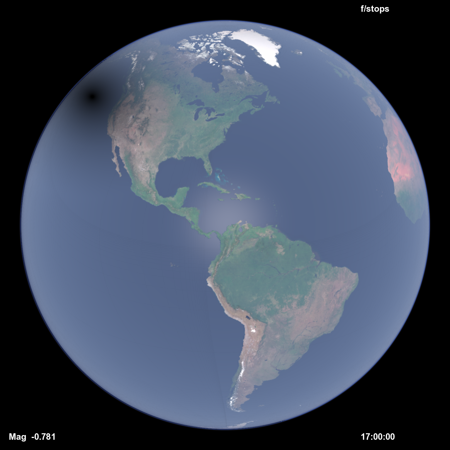 Simulated view of Earth during the upcoming solar eclipse in 2017, without clouds or sea ice.