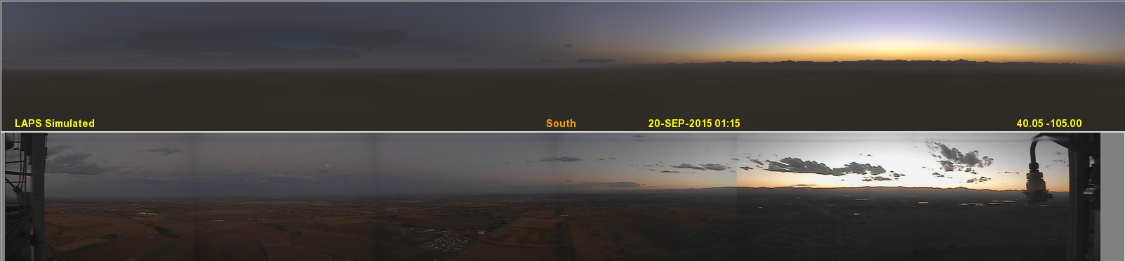 A sunrise simulation is shown above compared with a camera observation from Altona Colorado showing underlit clouds. Additional sunset photographs can be found on Les Cowley's Atmospheric Optics site. The underside of clouds tend to have the deepest reds when clouds are low, the sun is barely below the horizon, tropospheric aerosols are absent, and the viewer is at elevations near sea level.