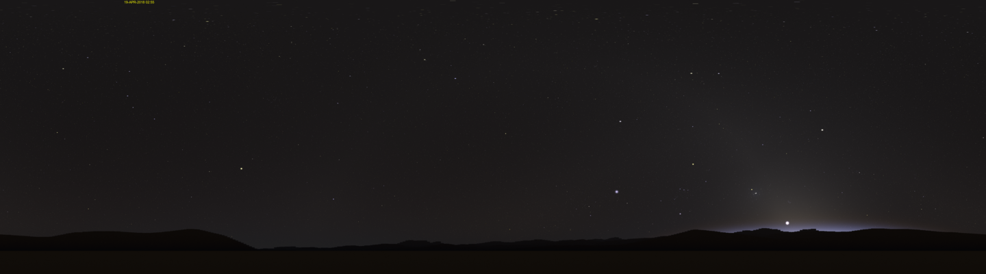 Above is a deeper twilight view from a rural mountain location with the sun about 13 degrees below the horizon. We see the twilight arch low in the west, along with zodiacal light, the crescent moon, and airglow. Here is an