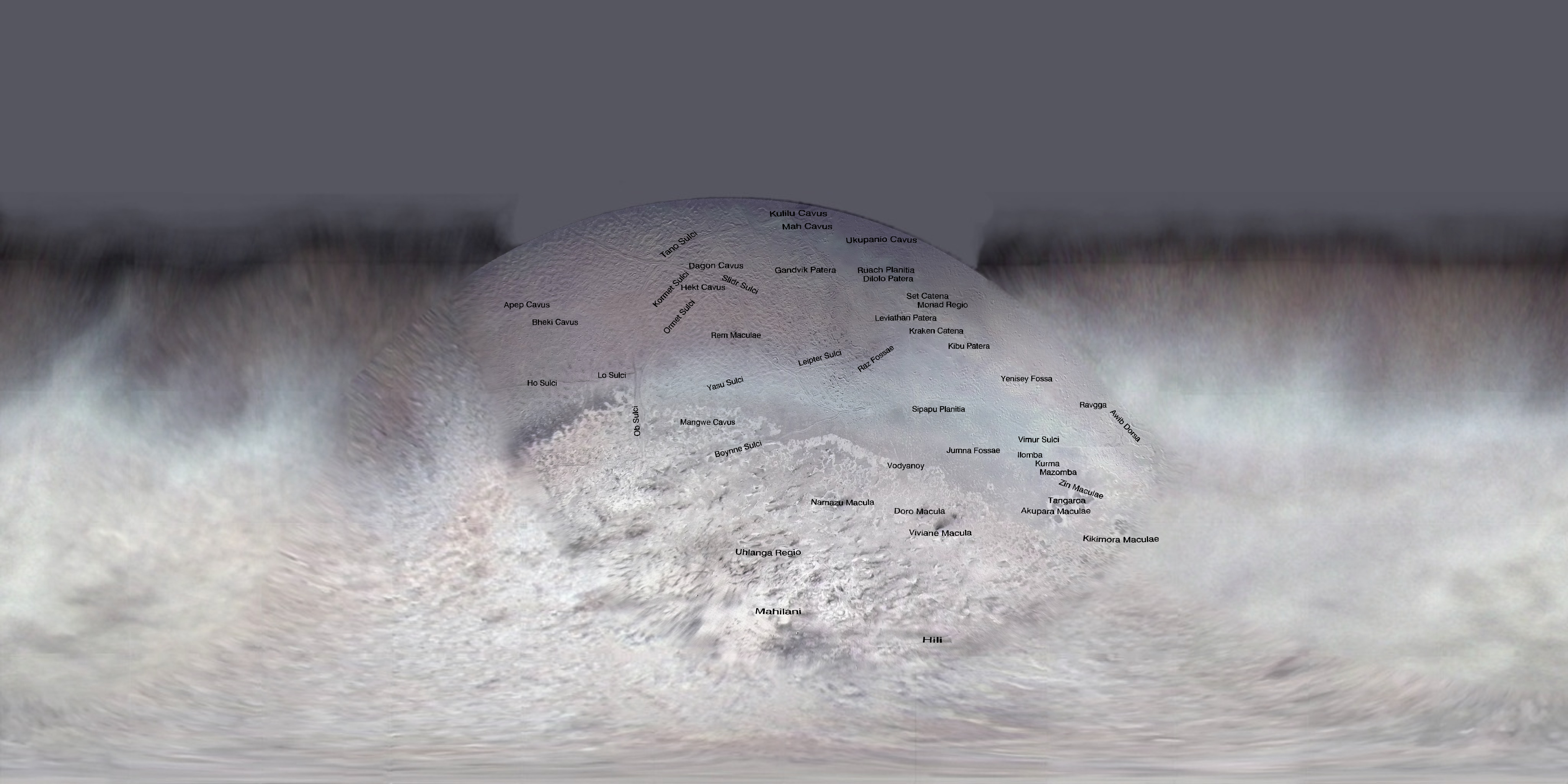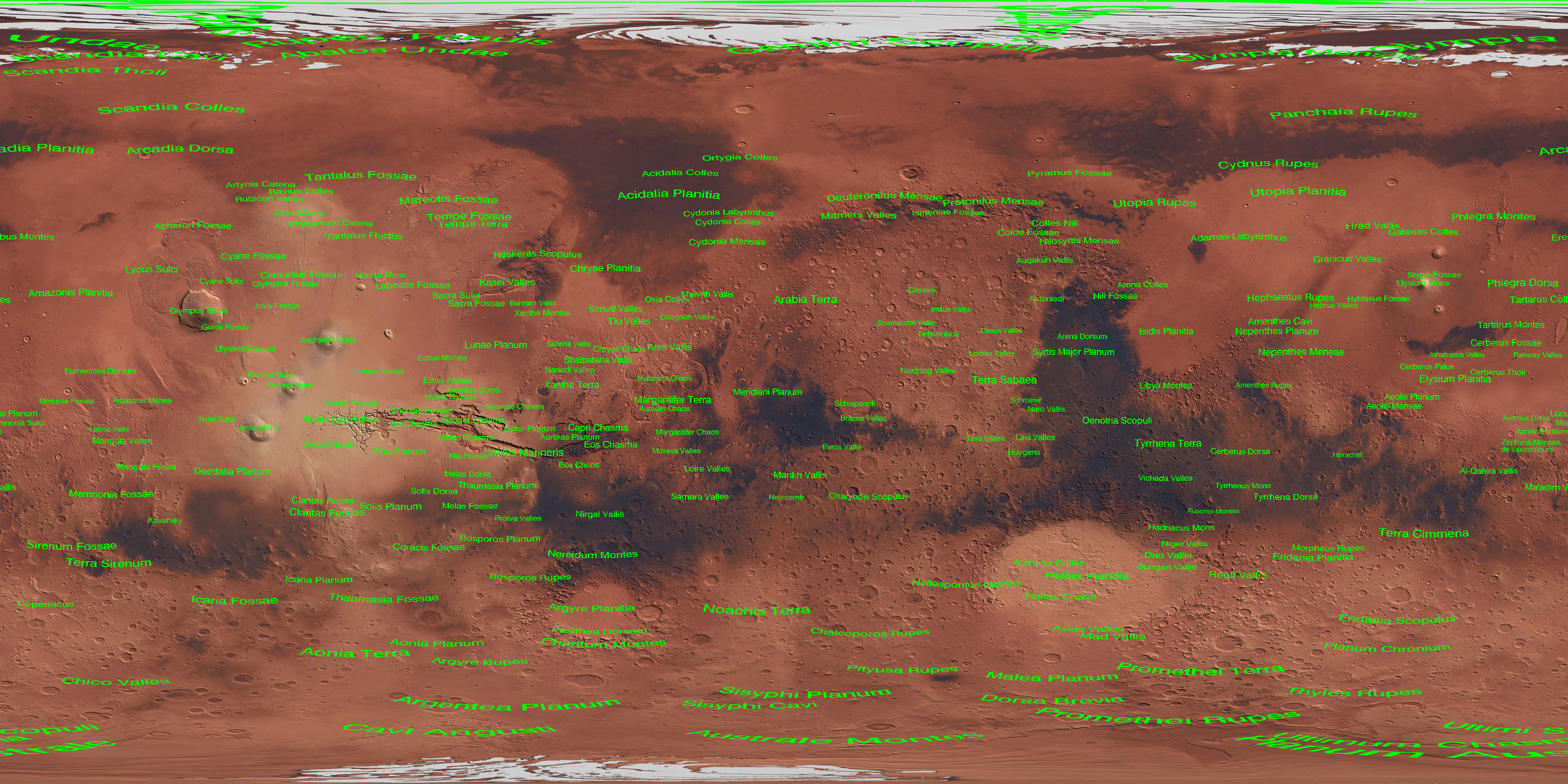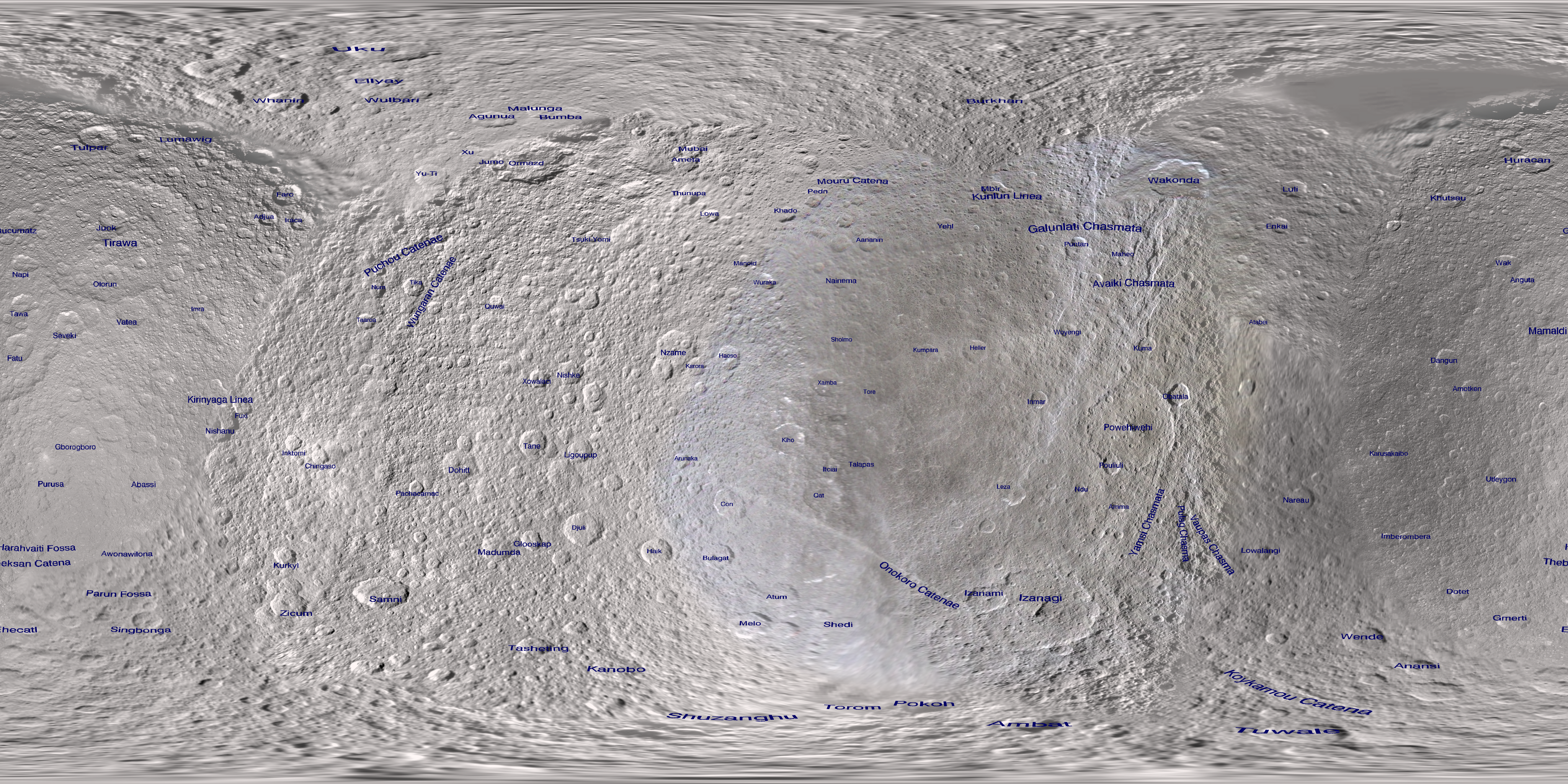 For Celestia and other users here are some versions with feature names overlain. The font is "pre-distorted" so it shows up well on a spherical projection. The nomenclature for the feature maps is from the USGS Gazeteer