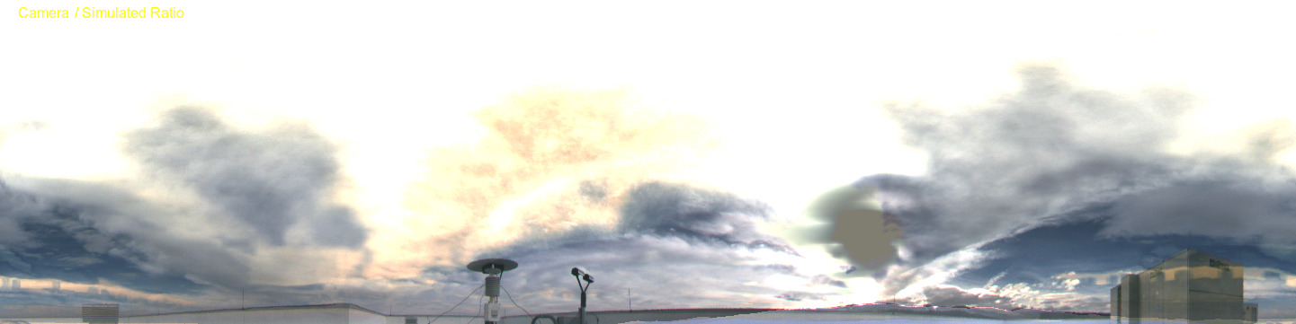 The image above on the left is simulated from an analysis of 3D hydrometeors using GOES ABI and other data. Aerosols are specified via namelist. The image on the right is from an EKO Instruments all-sky camera located at CIRA (at Colorado State University in Fort Collins) at the same time. In each fisheye lens view the zenith is in the center and north is up. The color balance of the simulated image is set to reproduce the "actual" colors/radiances when the display white point is set to closely match the sun. Thus to see a true apples to apples comparison (if for example you take your computer outside or right by a window), please set your display to a color temperature of 5780K (the sun's white color above the atmosphere). Some images are shown a bit dark to avoid saturating and losing details on the bright end. This can be compensated for by turning up your monitor brightness, thus showing a broader dynamic range.