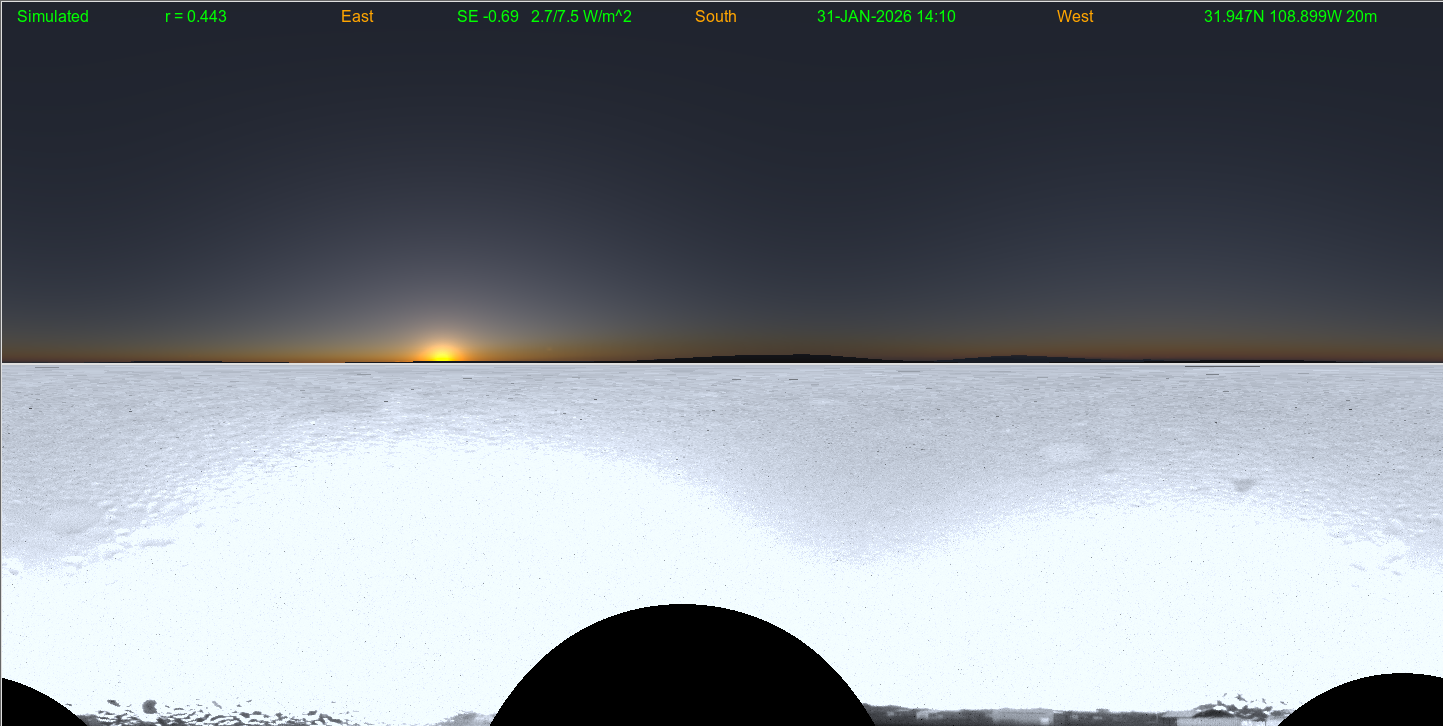 In these 360 degree panoramic (all-sky) views, a simulated cloud/aerosol analysis (using satellite though no camera) image is shown (top) compared with a remapped independent camera image (bottom)