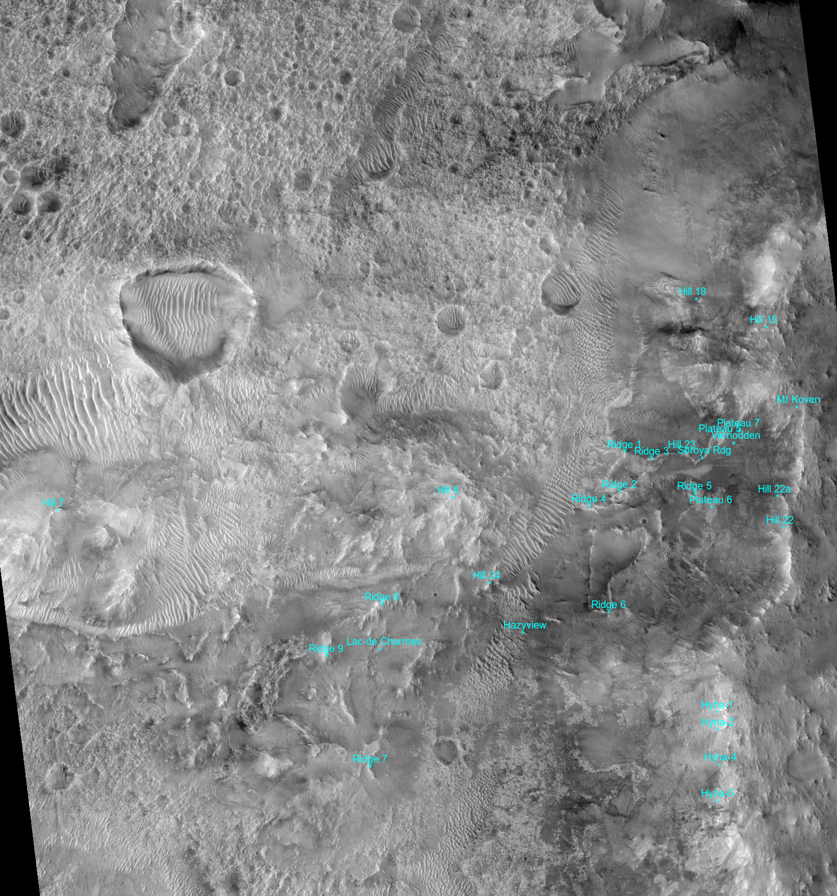 The annotated mosaics below are generated automatically using rover and feature coordinates (lat,lon,elevation). Features hidden by others in the foreground are omitted with an experimental 3D masking, based on the terrain horizon elevation angle and distance.